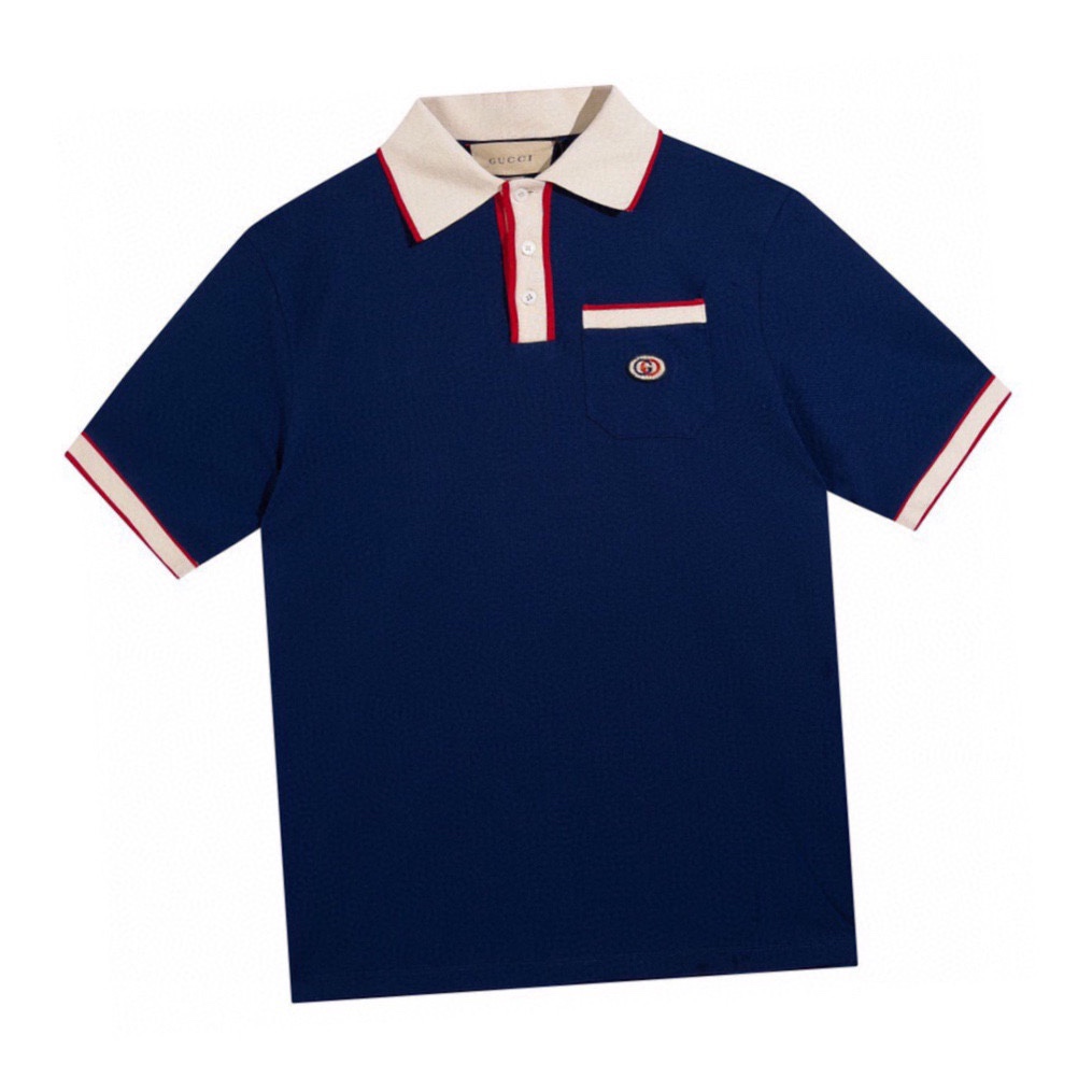 古驰/Gucci 夏季新品 口袋小双G刺绣翻领短袖polo衫 藏蓝色/米白色