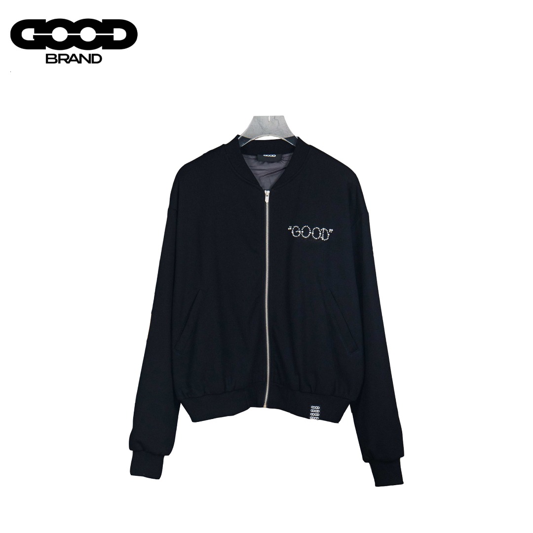 GOODBRAN珍珠串珠标语字母绣拉链连帽卫衣 黑色 米色