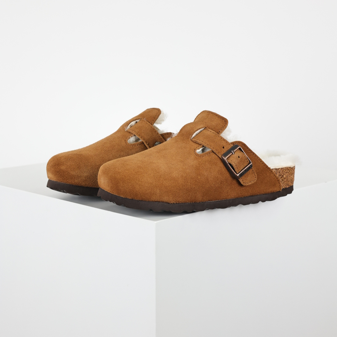 280 勃肯Birkenstock 勃肯懒人栗色加毛半拖Birkenstock London Suede Leather 伦敦系列包头平底复古软木底休闲半拖