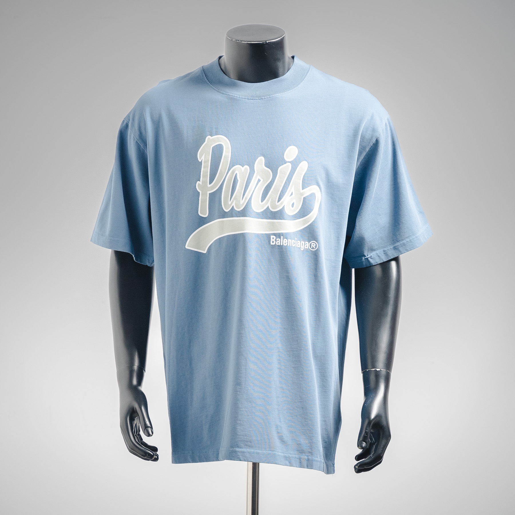 BALENCIAGA/巴黎世家25ss正面enjoy paris艺术印花洗水做旧短袖t恤 湖蓝色